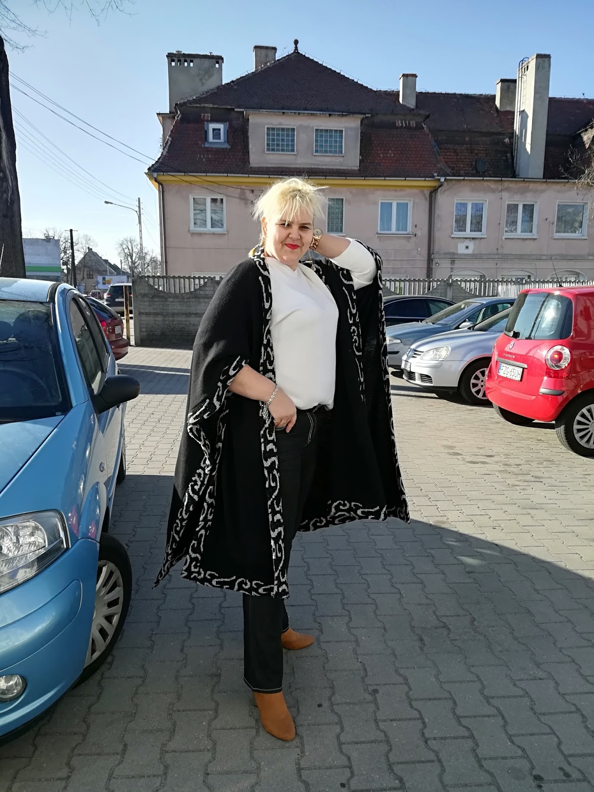 Czarne spodnie z białą nitką, świetnie pasują do czarnej narzuty zakupionej w SH z białym przypominającym mi egipskie znaki (nie wiem dlaczego, tak mi się kojarzy). Biały sweterek dla rozjaśnienia stylizacji. Botki z Born2be, ostatnio moje ulubione karmelowe na złotym obcasie. Odrobinę mojej niemarkowej biżuterii i pasek HUGO BOSS. Moim skromnym zdaniem wygląda bardzo ciekawie...